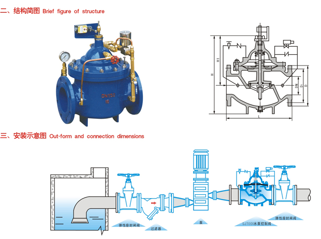 Used at the pump outlet to carry out an accurate open or close via the pilot control of the solenoid valve and。as a check control valve,to prevent the medium from back-flow.When the pump is about to stop water supply,it is slowly closed by about 90% first to prevent both water hammer and water shock noise from being produced due to sudden stop of the pump and.when the pump stops completely.it is fully closed t0 prevent the water from back flow with the pump so as to effectively protect it from counter movement due to the shock of the back-flow This valve can effectively prevent water hammer and wa-ter shock noise.be reliably sealed and long time used and stably move The solenoid valve can use either AC220V or DC24V power.