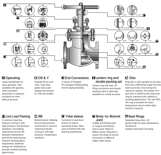 Standard body/bonnet materials include nine grades of carbon, low alloy and stainless steels, For special apolications they can be supplied in other grades of alloy and stainless steell, There′s′a full range of trim materials to match any service. Optional packing and gasket materials are available for a full range of service conditions.